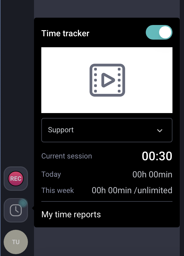 While actively working on a project, you can minimize the module by clicking on the "Time tracking" icon. Your time will continue to be tracked, as denoted by the green dot on the tracker. To bring the module back onto the screen, simply click on the "Time tracking" icon again.