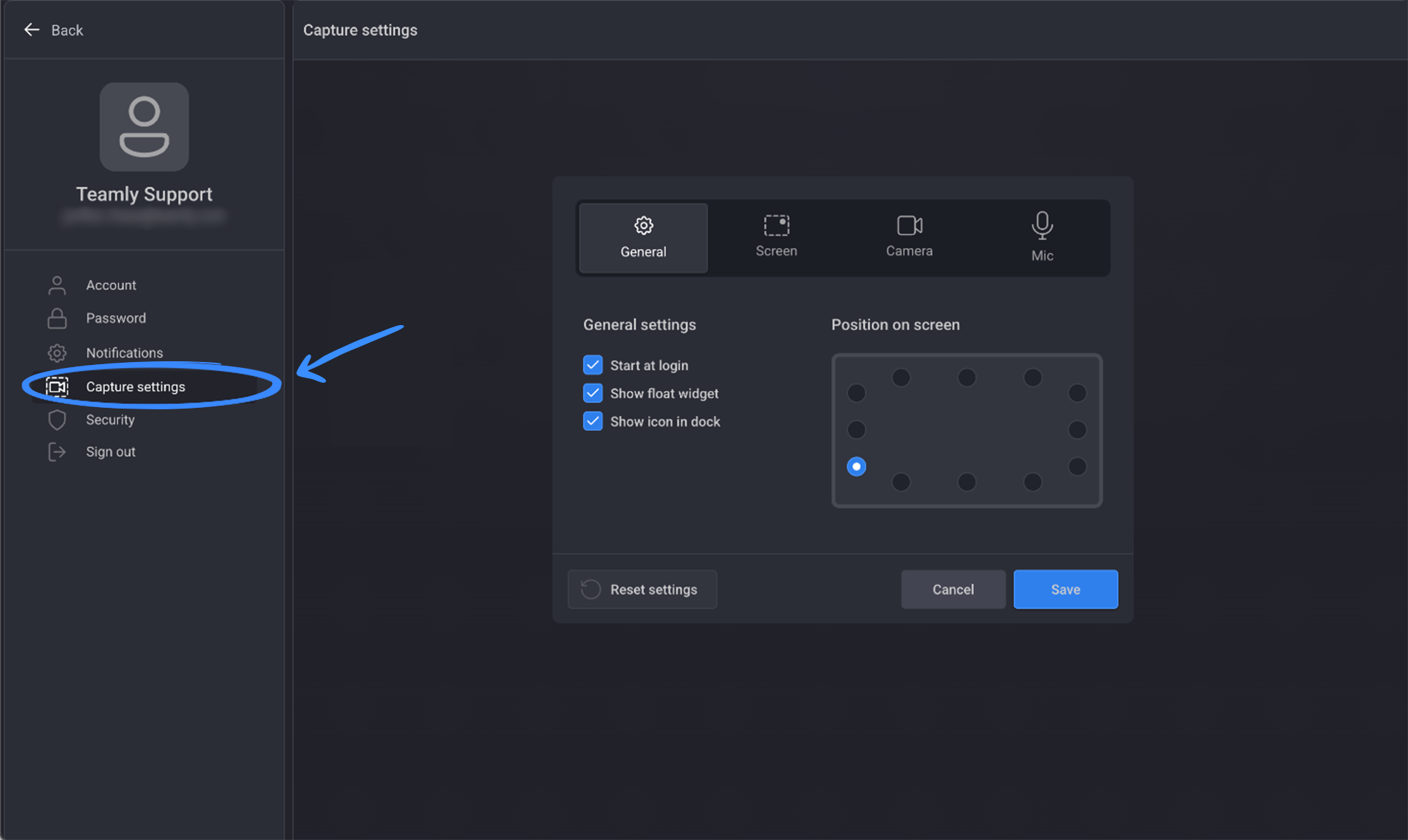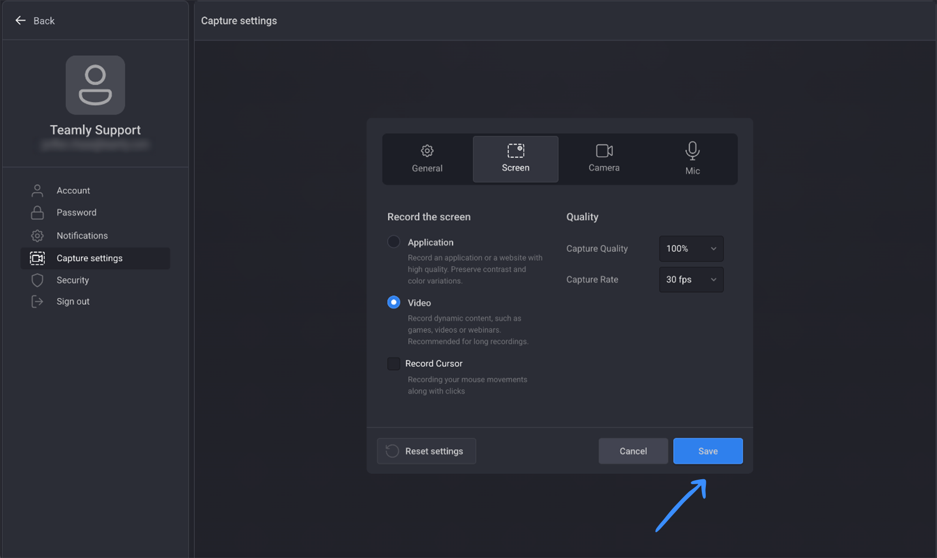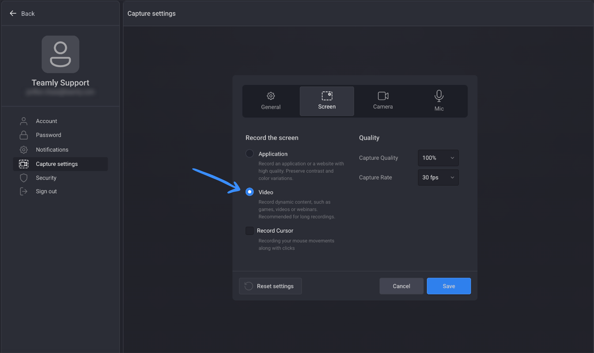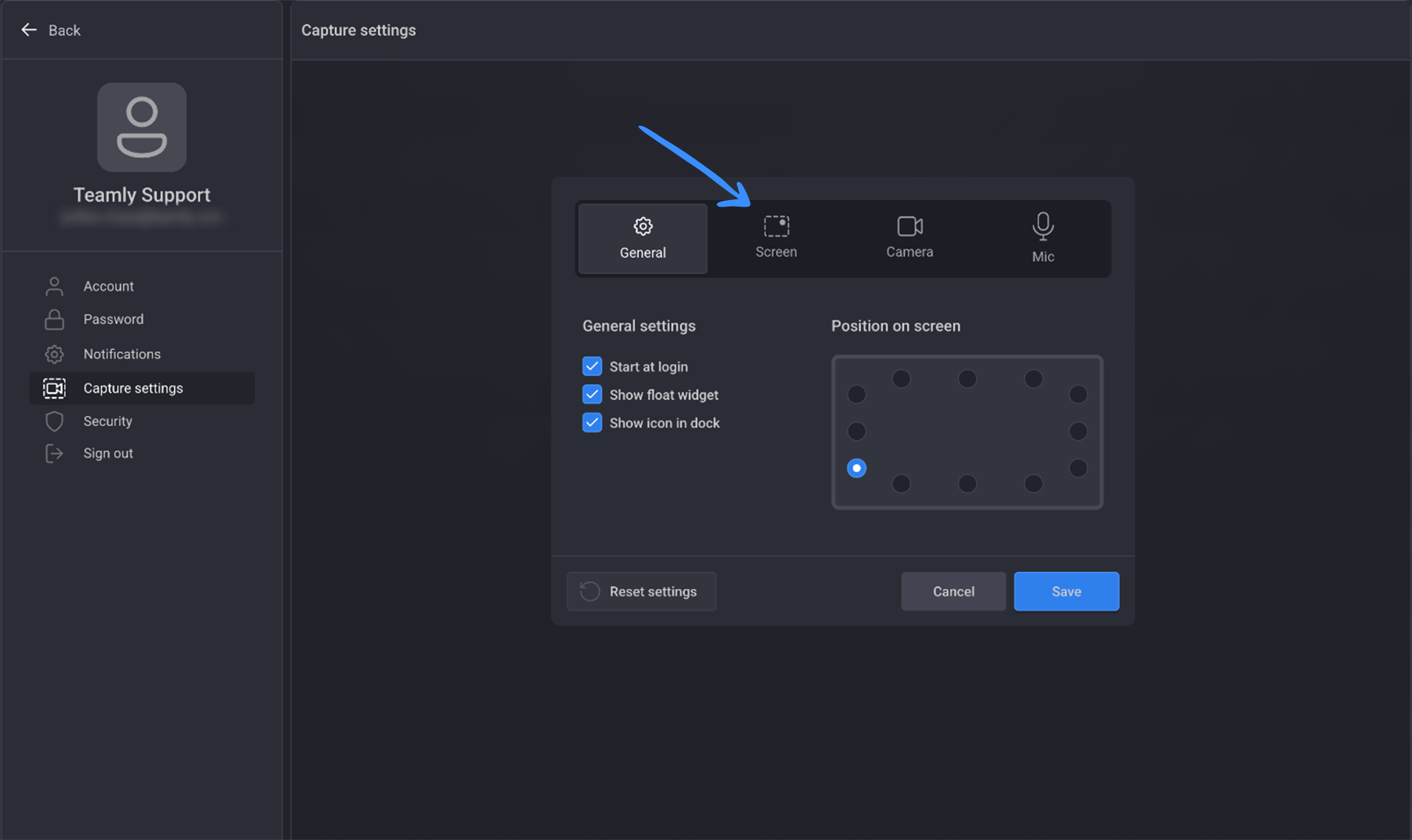 ⚠️ The "Capture settings" tab is exclusively available in the desktop app, which you can download here. Navigate to the "Screen" tab.