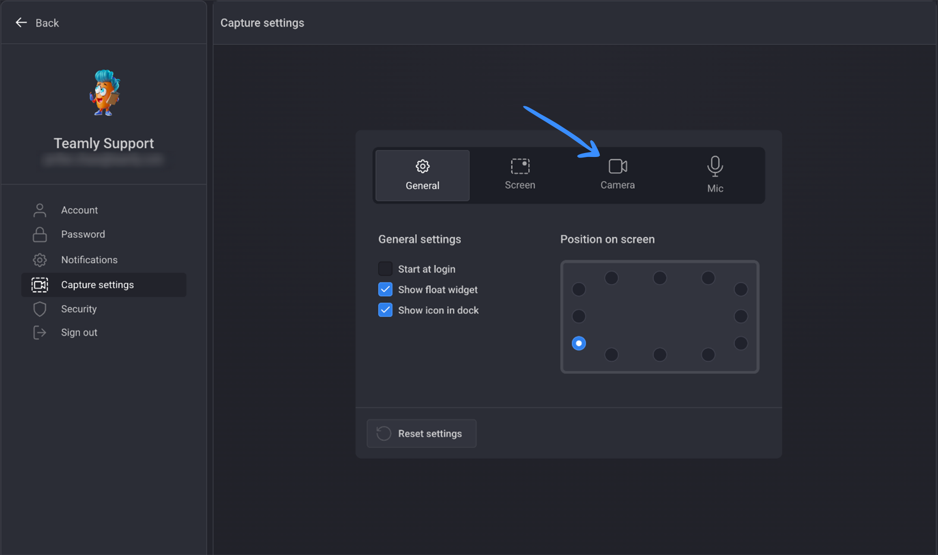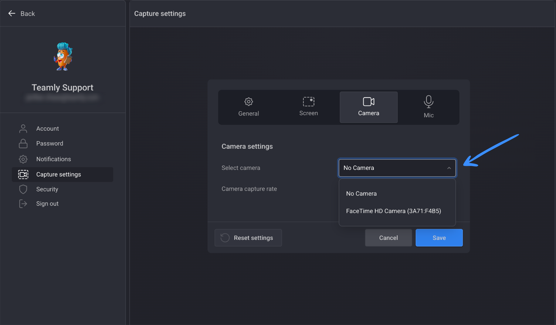 ⚠️ The "Capture settings" tab is exclusively available in the desktop app, which you can download here.Navigate to the "Camera" tab.