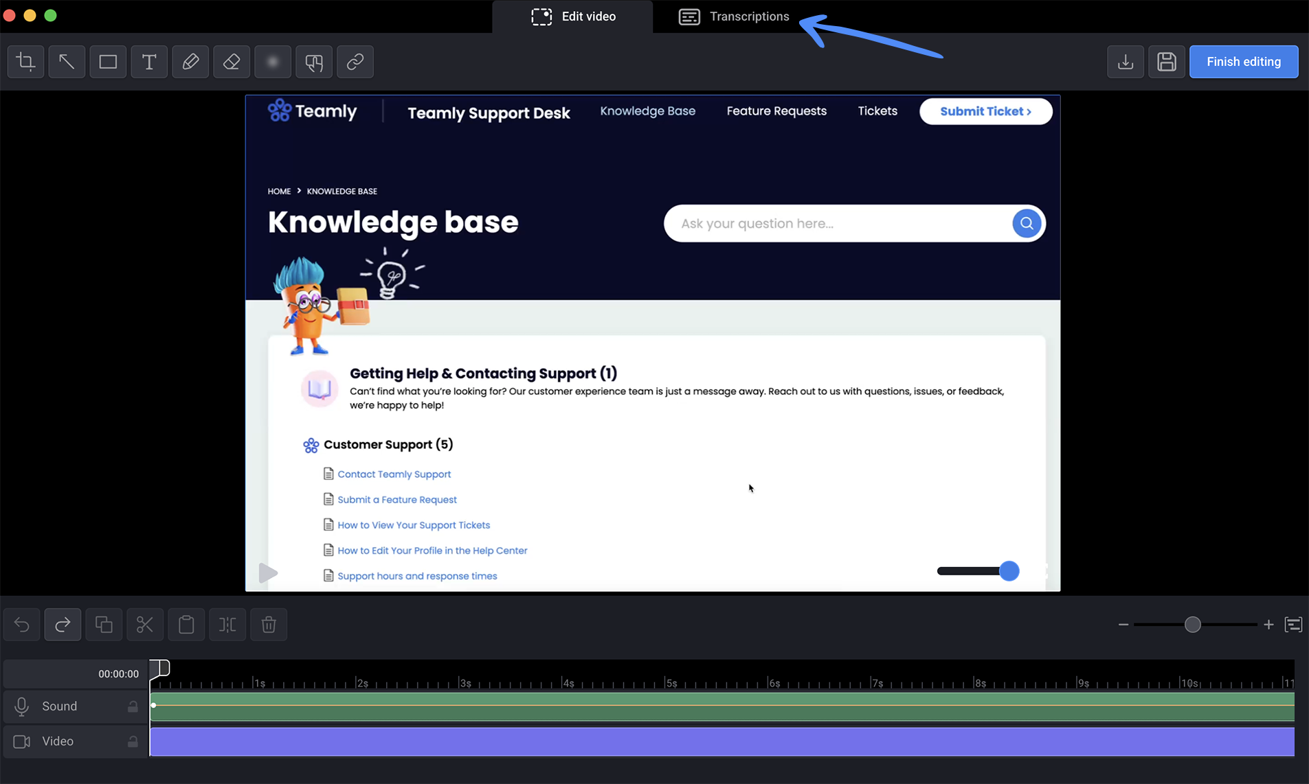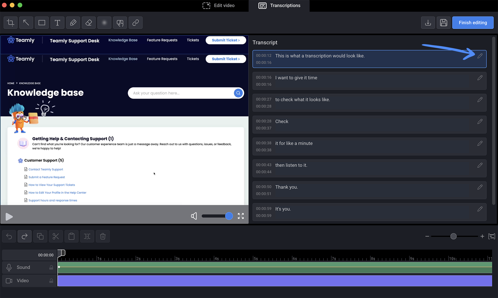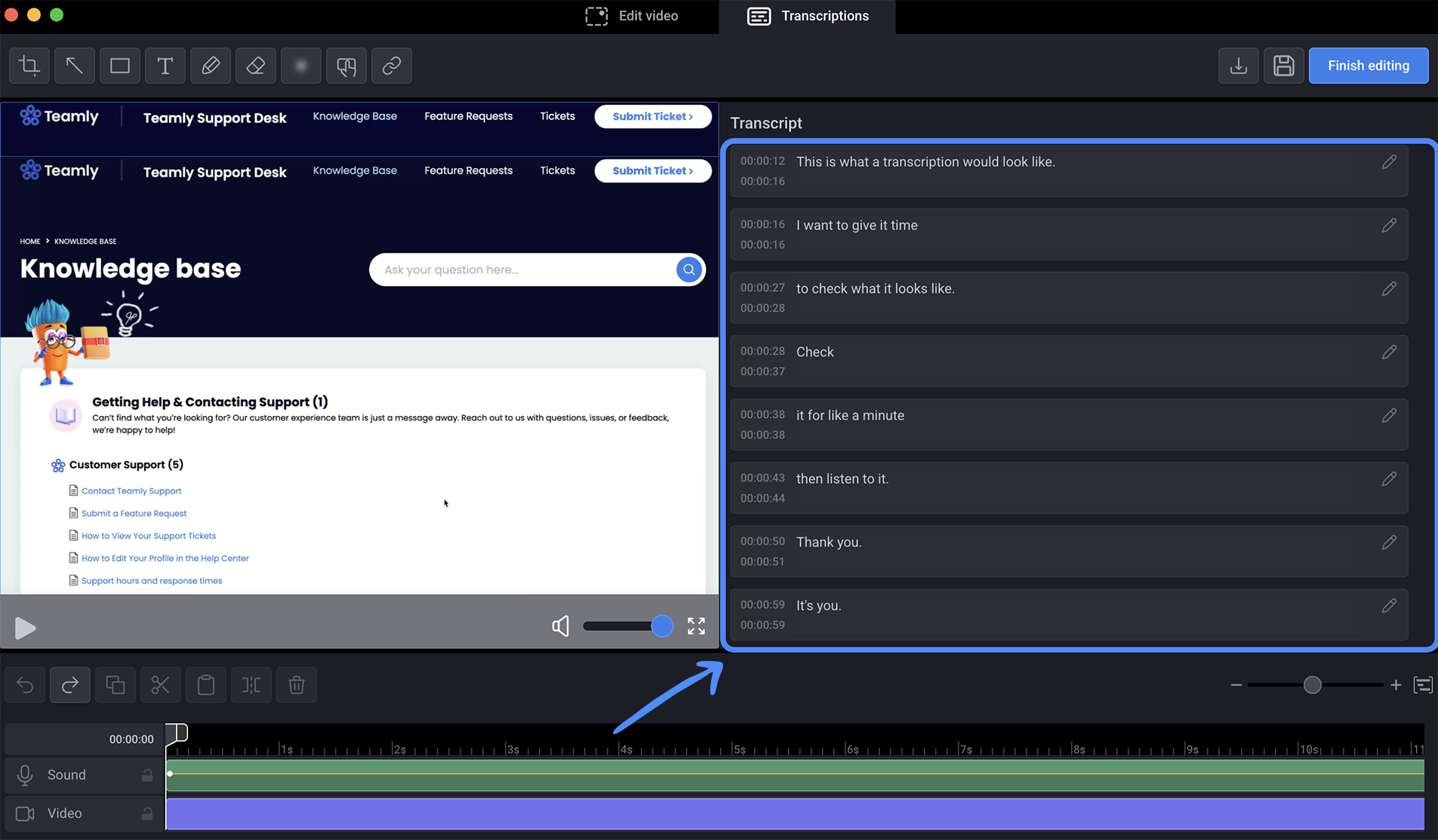 The video editor modal will open, allowing you to navigate to the “Transcriptions” tab.