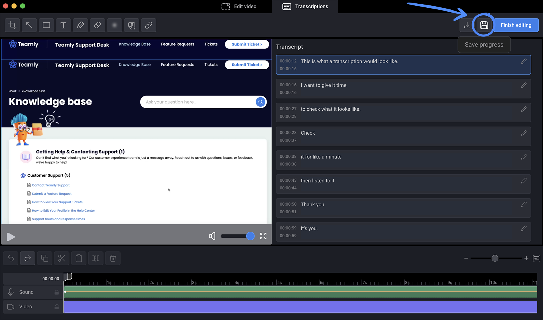After editing the transcription, be sure to click “Save progress” to keep your changes.